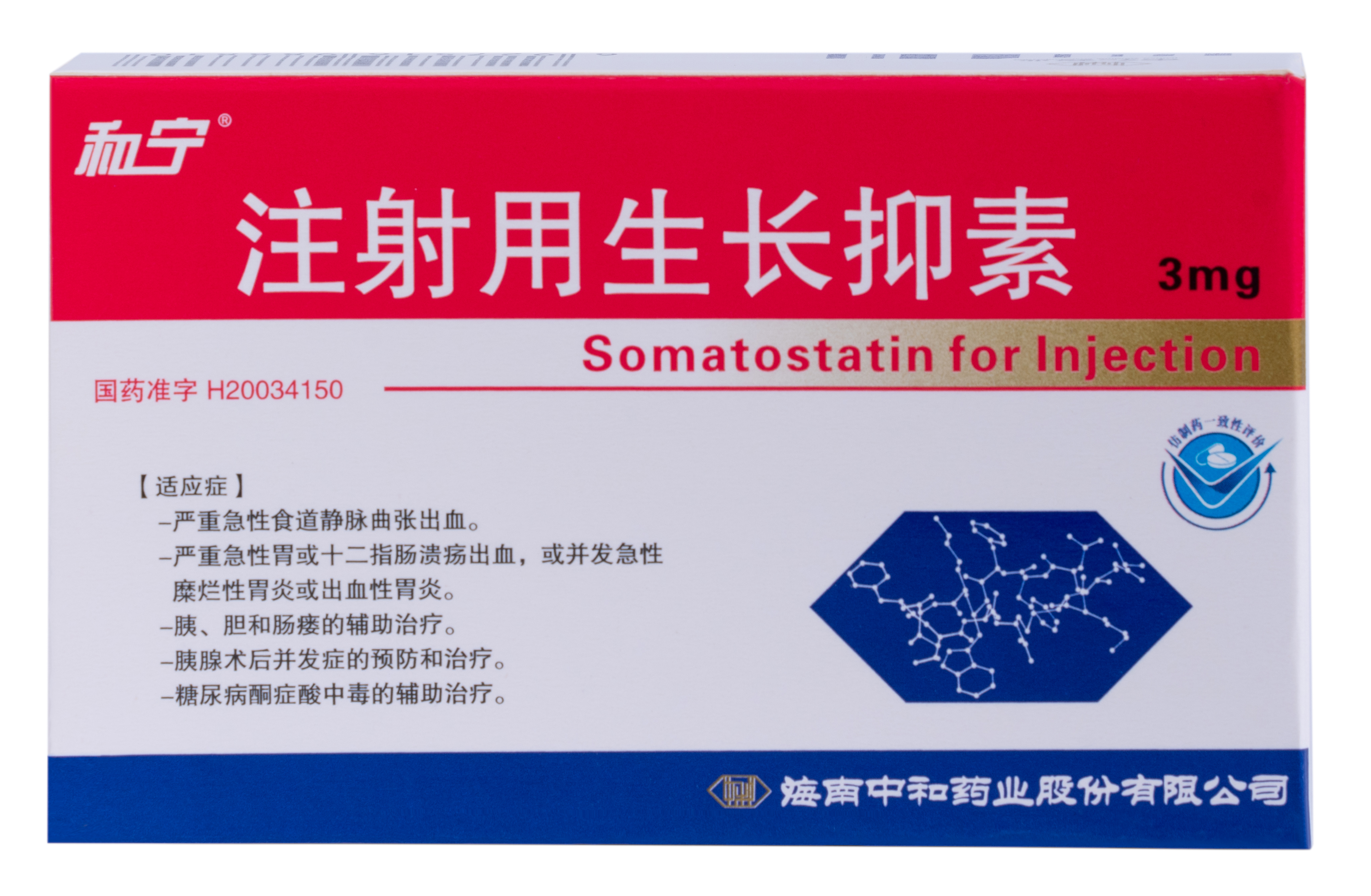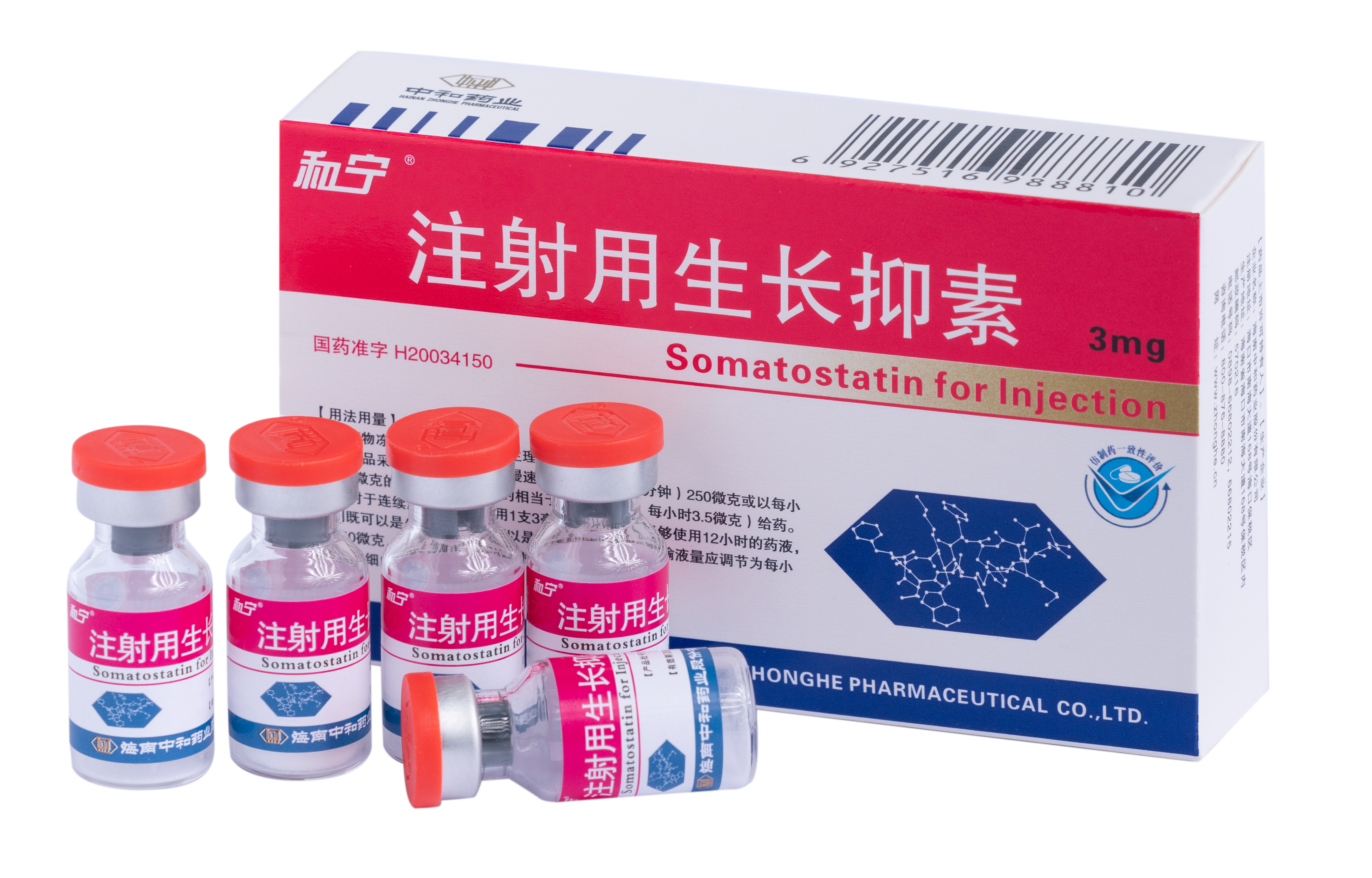 生長抑素是人工合成的環(huán)狀十四氨基酸肽,其與天然生長抑素在化學結(jié)構(gòu)和作用機理上完全相同。