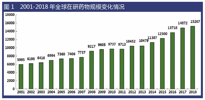 從2001-2018年數(shù)據(jù)看,全球在研新藥數(shù)量保持持續(xù)增長態(tài)勢(shì),尤其是2011年以來,全球在研新藥數(shù)量呈現(xiàn)明顯增長勢(shì)頭。然而需要特別注意的是,雖然2014年以來全球在研新藥數(shù)量同比增幅均超過8.0%,但近兩年增速逐年放緩,2016年、2017年、2018年全球在研新藥數(shù)量增幅分別為11.5%、8.4%和2.7%。