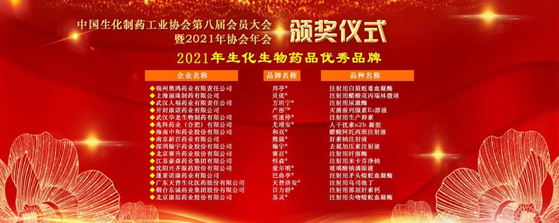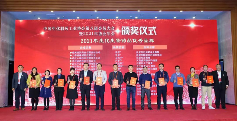 2021年12月18日,在北京召開的“中國生化制藥工業(yè)協(xié)會(huì)第八屆會(huì)員大會(huì)暨2021年協(xié)會(huì)年會(huì)”上,海南中和藥業(yè)產(chǎn)品和雙?醋酸阿托西班注射液榮獲“2021年生化生物藥品優(yōu)秀品牌”稱號(hào)。