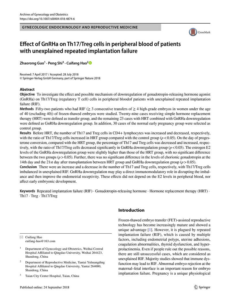 目的:探討促性腺激素釋放激素激動(dòng)劑(GnRHa)降調(diào)對(duì)原因不明的反復(fù)移植失敗(RIF)患者外周血Th17 / Treg(調(diào)節(jié)性T細(xì)胞)細(xì)胞的影響及其可能機(jī)制。