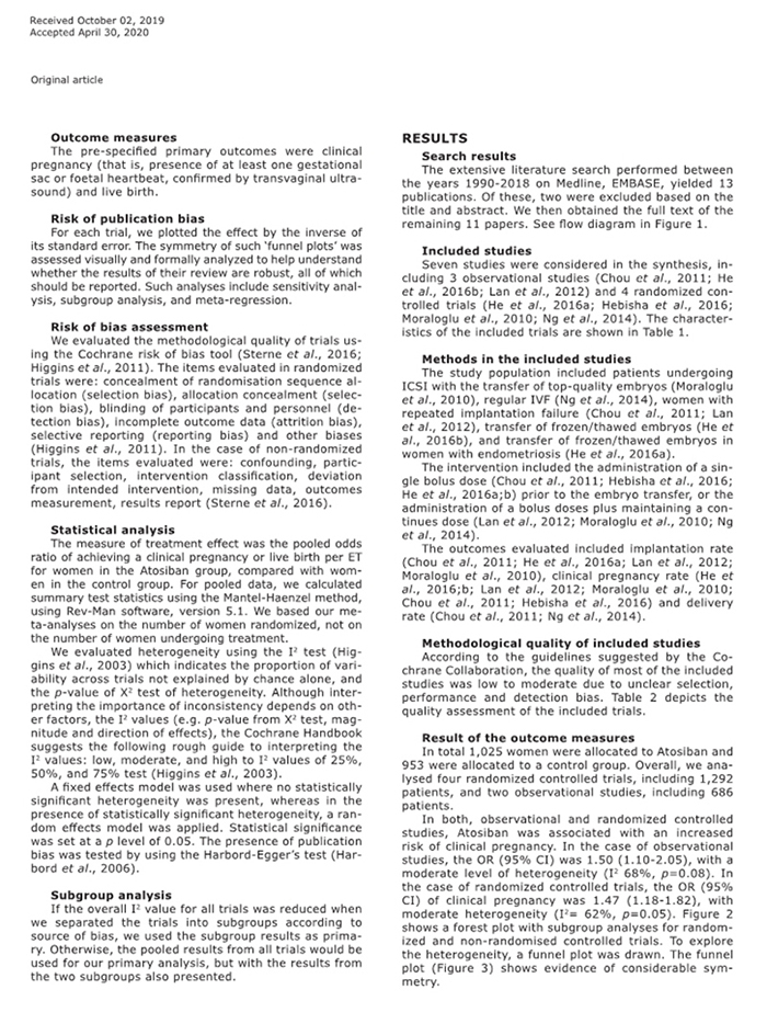 方法:數(shù)據(jù)來源:使用MEDLINE和EMBASE(1990-2019)數(shù)據(jù)庫對英文文章進行系統(tǒng)回顧,檢索詞:包括阿托西班、胚胎移植。研究選擇:我們納入將阿托西班與對照組進行胚胎移植結(jié)果比較的研究。數(shù)據(jù)提?。河蓛晌蛔髡呤褂妙A(yù)定義的數(shù)據(jù)字段(包括研究質(zhì)量指標(biāo))獨立提取論文。