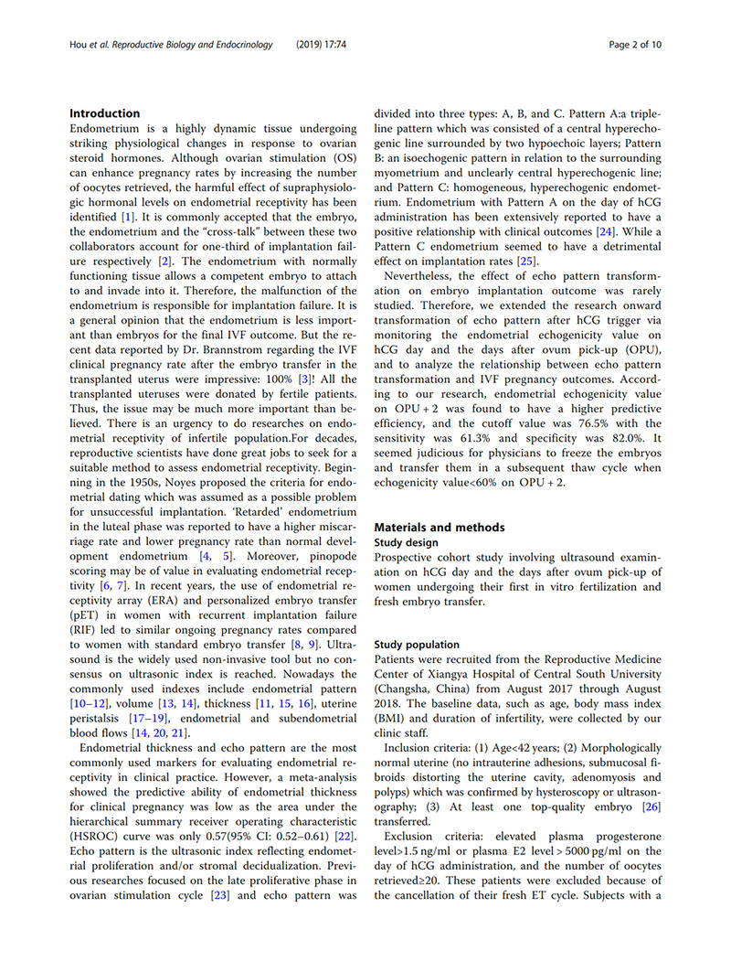 背景:非侵入性測量子宮內(nèi)膜容受性的方法很有價值,因為它有可能改善體外受精(IVF)結(jié)局。有人認為hCG給藥當天的子宮內(nèi)膜回聲是子宮內(nèi)膜容受性的良好標志。在日常實踐中,我們注意到胚胎移植日子宮內(nèi)膜非均質(zhì)高回聲的患者通常妊娠率較低。因此,我們將延伸擴展了hCG觸發(fā)后子宮內(nèi)膜回聲模式轉(zhuǎn)化的研究,以分析子宮內(nèi)膜回聲改變與IVF結(jié)局之間的關(guān)系。