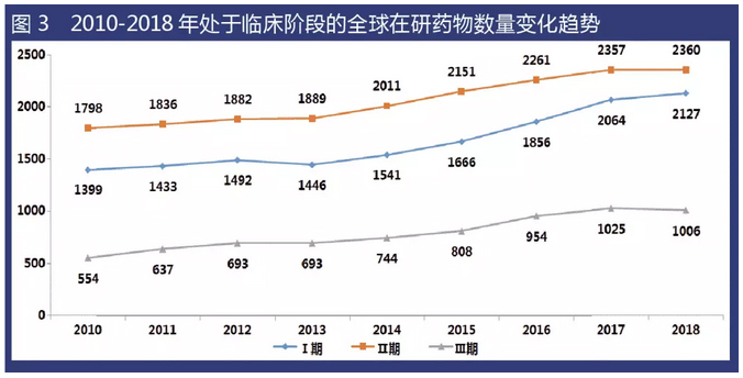 對(duì)處于臨床研究階段的在研藥物數(shù)據(jù)進(jìn)一步分析后發(fā)現(xiàn),2018年處于Ⅰ期、Ⅱ期和Ⅲ期臨床研究階段的藥物數(shù)量分別為2127、2360和1006個(gè),增幅分別為3.1%、0.1%和-1.9%。處于臨床Ⅱ期的藥物數(shù)量基本無變化,但處于臨床Ⅲ期的藥物數(shù)量則出現(xiàn)了小幅下滑,因此不難看出,處于研發(fā)后期的品種仍存在流失率較高的情況,應(yīng)引起注意。