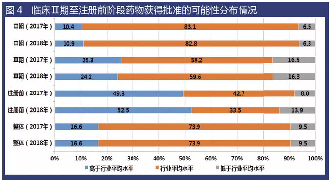 從統(tǒng)計(jì)數(shù)據(jù)來看,2018年“注冊(cè)前”藥物獲得批準(zhǔn)的可能性高于行業(yè)平均水平的藥物比例約為52.5%,較2017年(49.3%)有所升高;臨床Ⅲ期情況則相反,2018年獲得批準(zhǔn)的可能性高于行業(yè)平均水平的藥物比例為24.2%,較2017年(25.3%)有所下降。從臨床研究階段的整體數(shù)據(jù)看,2018年在研藥物獲批可能性的分布情況,與2017年數(shù)據(jù)基本一致。