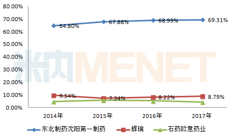 從2017年的數(shù)據(jù)看,東北制藥以69.31%的市場份額位居首位,原研廠家輝瑞以8.79%的比例緊接其后。從近幾年各大品牌的市場份額變化看,東北制藥基本呈現(xiàn)穩(wěn)定增長的態(tài)勢,輝瑞的市場份額則有所波動。