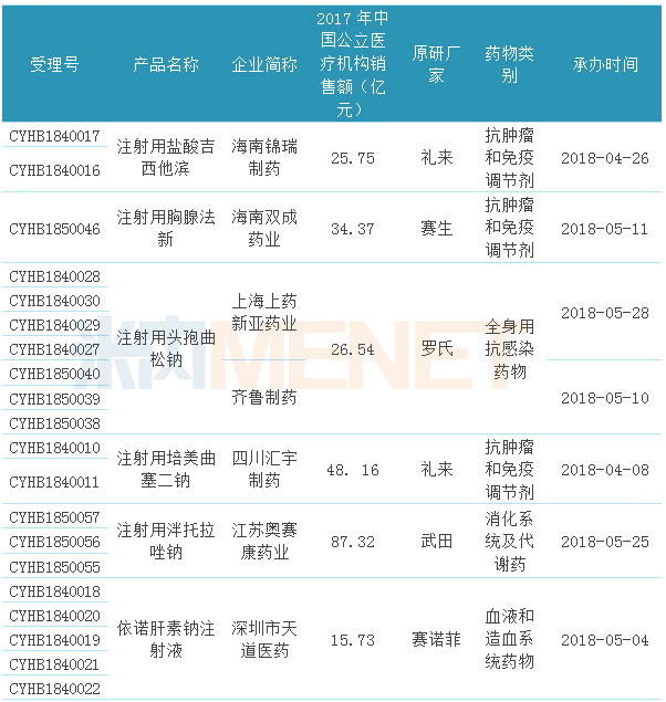 從治療類別看,14個品種中有5個為抗腫瘤和免疫調(diào)節(jié)劑,可見抗腫瘤領(lǐng)域是藥企們申報的重點,消化系統(tǒng)及代謝、神經(jīng)系統(tǒng)藥物、全身抗感染藥物均有2個產(chǎn)品;從產(chǎn)品的申報廠家看,齊魯制藥及子公司申報的產(chǎn)品最多;從申報的產(chǎn)品看,除了注射用頭孢曲松鈉有2家企業(yè)同時申報外,其他品種均只有1家企業(yè)申報;從產(chǎn)品的銷售額看,2017年在公立醫(yī)療機構(gòu)終端銷售額超過10億元的產(chǎn)品有11個(超過20億元的有8個),其中注射用泮托拉唑鈉接近90億元,注射用培美曲塞二鈉及多西他賽注射液接近50億元。