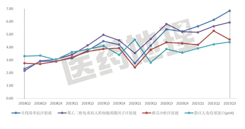 具體來看,近三年間排名只升不降的有4個(gè)產(chǎn)品,競爭非常激烈。在2018年二季度時(shí),4個(gè)產(chǎn)品的排名依次是靜注人免疫球蛋白、碘克沙醇、貝伐珠單抗和粒細(xì)胞刺激因子,季度銷售額最大差距為1.14億元;但到了2021年三季度,排名已經(jīng)變成了貝伐珠單抗、粒細(xì)胞刺激因子、碘克沙醇和靜注人免疫球蛋白,季度銷售額最大差距擴(kuò)大至2.44億元。未來或有新產(chǎn)品入局。