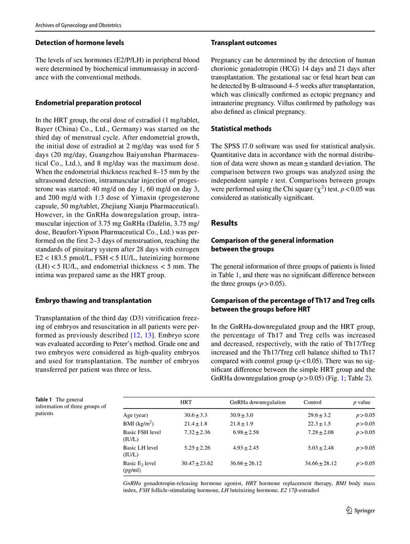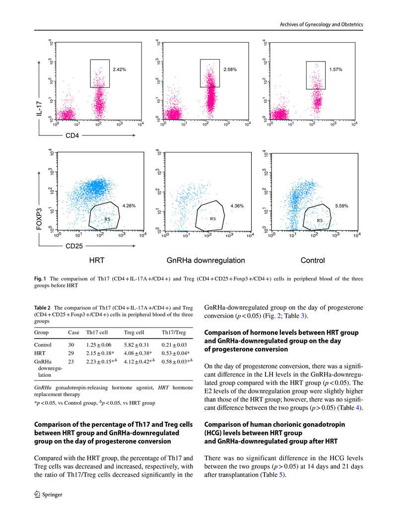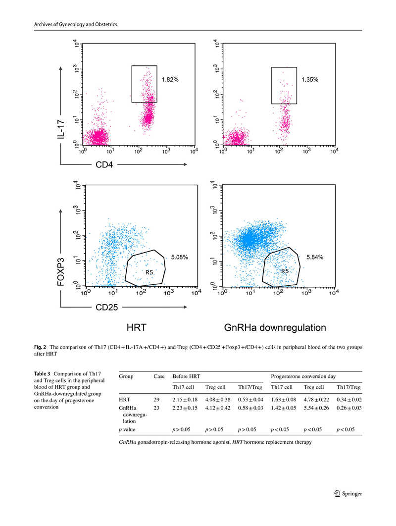 結(jié)果:HRT前,HRT組與對(duì)照組相比,CD4+淋巴細(xì)胞中的Th17和Treg細(xì)胞數(shù)量分別增加和減少,Th17 / Treg細(xì)胞比值升高(p<0.05)。在孕酮轉(zhuǎn)化當(dāng)天,與HRT組相比,GnRHa降調(diào)組的Th17和Treg細(xì)胞百分比分別降低和升高,Th17 / Treg細(xì)胞比值顯著降低(p<0.05)。GnRHa降調(diào)組的雌激素(E2)水平略高于HRT組,兩組間差異無統(tǒng)計(jì)學(xué)意義(p> 0.05)。此外,HRT組和GnRHa降調(diào)組在移植后第14天和第21天的絨毛膜促性腺激素水平?jīng)]有顯著差異(p>0.05)。