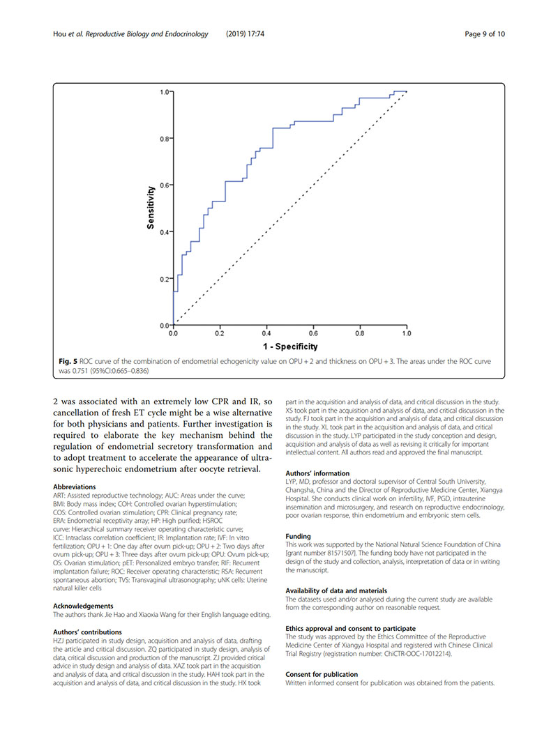 結(jié)論:建議用取卵后第2天(OPU+2)的子宮內(nèi)膜回聲值評價子宮內(nèi)膜容受性。當OPU+2的回聲值<60%時,臨床醫(yī)生似乎適合提供“全冷凍”IVF周期,并在隨后的凍融胚胎周期中進行移植。